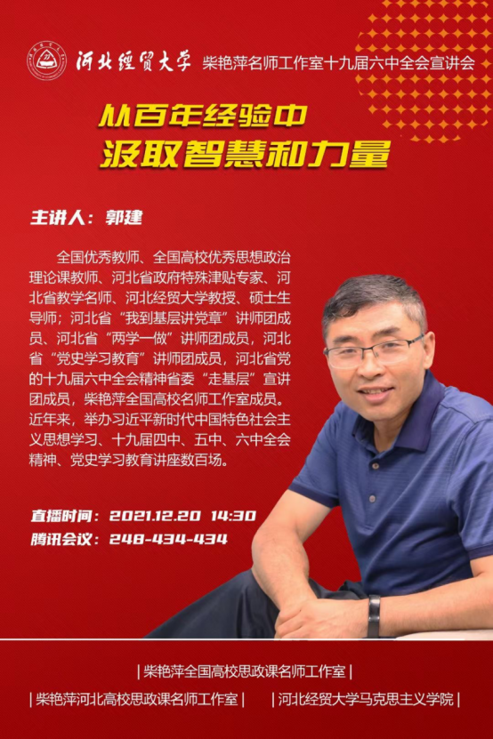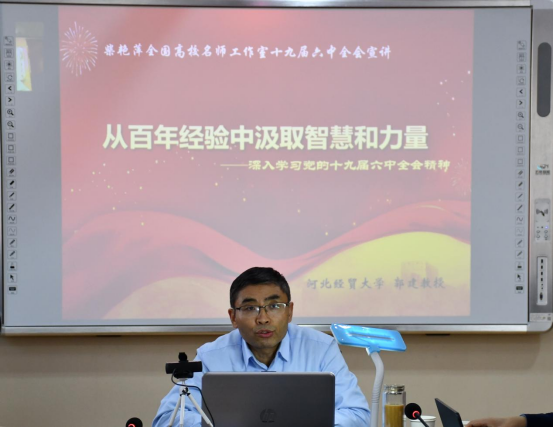 郭建教授做了题为《从百年经验中汲取智慧和力量——深入学习党的十九届六中全会精神》的报告。郭建是全国优秀教师、全国高校优秀思政课教师、河北省党的十九届六中全会精神省委“走基层”宣讲团成员。他首先介绍了在载入史册的三次历史性《决议》中,中国共产党是如何正确总结经验的。其次,他详细介绍了十九届六中全会《决议》的核心要义与亮点,并深刻总结了中国共产党百年奋斗的四大历史成就与五大历史意义。最后,他通过深入解读“十个坚持”,揭示了我们党过去成功的原因和未来成功的路径。