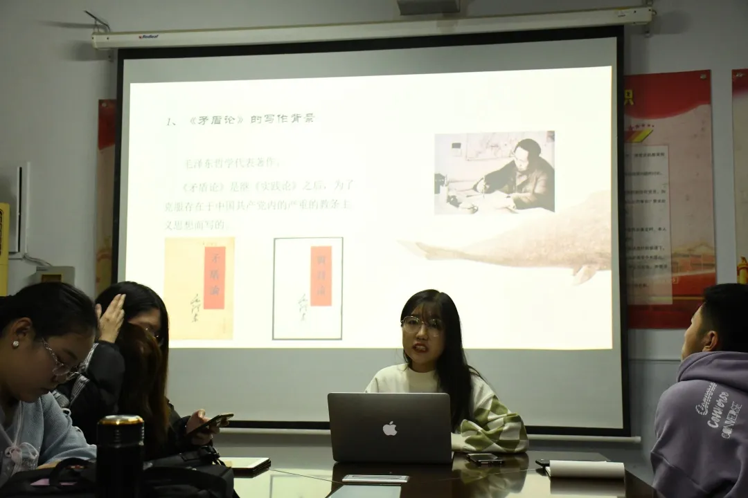 本次讲座由2019级马克思主义中国化专业的冯志丹同学主讲。冯志丹同学主要从《矛盾论》的写作背景和理论来源、理论创新、理论价值和现实意义三个方面进行了讲解。首先,冯志丹同学讲述了《矛盾论》是继《实践论》之后,为克服存在于中国共产党内的严重的教条主义思想而写的。并从马克思主义的辩证哲学和中国传统辩证思想的两个方面阐释了矛盾论的理论来源。其次,她指出毛泽东在《矛盾论》中提出的理论创新,为马克思主义的基本原理同中国具体实际的结合提供了科学的理论依据。最后,冯志丹同学结合中国革命的经验及中国革命的具体实践,详细解读了《矛盾论》的学理意义及现实意义。