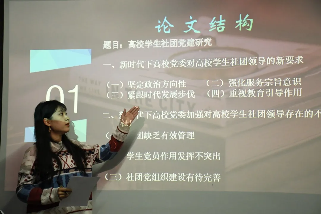 本次学术讲座由2019级党建专业的崔尚祯同学主讲。崔尚祯同学以《浅析高校党委加强对大学生社团领导的研究》为题,向大家讲解了该篇论文的选题背景、论文结构及本文指导教师的修改意见这三个方面。首先,崔尚祯同学详细阐述了本篇论文的选题原因即:根据中央提出的“积极探索在学生社团组织中建立党组织”的指示,联系实际,发现高校在社团领域中的党建工作亟待完善,研究社团党建工作具有现实意义。其次,她详细介绍了该篇论文的3个组成部分,提出要从新时代的背景出发,寻求党建工作进社团过程中的现实困境及解决路径。此外,在论文结构讲解中,崔尚祯同学加入了有关论文修改的若干建议,提供老师对于本篇论文的指导意见,使同学们从新的视角与更为专业的角度了解论文写作及论文修改过程中可能遇到的问题及解决办法。