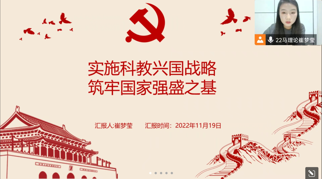 11月26日晚,我院研究生会“悦读二十大,奋进新征程”学习贯彻二十大精神系列活动第三期在线上举行。系列活动第三期以“实施科教兴国战略,强化现代化建设人才支撑”为主题,共有四位主讲人参与主讲,第三讲主讲人为2022级马克思主义理论专业研究生崔梦莹,全院62名研究生参加了此次活动。