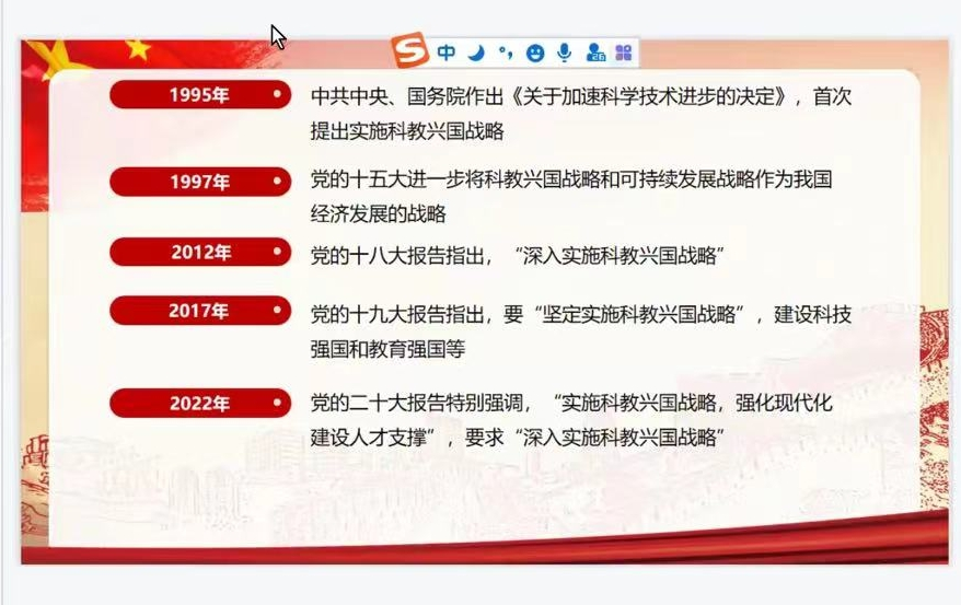 蔡亚荣同学主讲的题目为《以科教兴国战略助力中国式现代化》。党的二十大报告首次将教育、科技、人才作为一个整体进行论述,进一步理顺了建设教育强国、科技强国、人才强国的内在联系。唯有加快建设教育强国,才能为建设科技强国、人才强国涵养源头活水;唯有加快建设科技强国,才能充分释放科技这个“第一生产力”、激活创新这个“第一动力”;也唯有加快建设人才强国,才能为科技创新提供人力资源保障。实现中华民族伟大复兴,基础在于教育,党中央历来重视教育事业,在当今中国式现代化建设的历史征程中,教育的作用更加突出。只有推进教育公平,办好人民群众满意的教育,才能有力的推动中国式现代化实现。