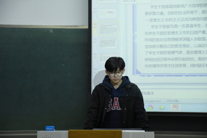 张朝阳同学主讲的题目为《警惕身边的“官僚主义”》。他首先梳理了官僚主义形成发展的历史脉络,指出官僚主义问题由来已久,值得重视,回避不得。在不同历史时期官僚主义表现为各种不同的类型、有着不同的危害。我们要高度警惕官僚主义的严重危害,尤其是要警惕身边的官僚主义。随后,他指出学生干部是高校联系广大同学的桥梁和纽带,是开展大学生思想政治教育工作的重要依靠力量。但在新的社会形势下,部分高校学生干部出现一些不良倾向,如官僚主义、功利主义盛行,责任心缺失等。最后,他对如何整治身边的官僚主义提出了自己的建议,指出在严把干部任命关的同时,要加强对学生干部的锻炼,提高学生干部的综合素质和实践能力。
