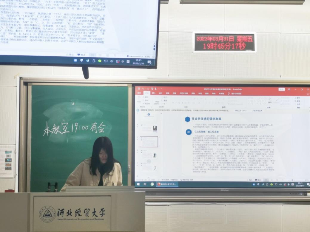 3月31日晚,我院“践行二十大,学‘习’讲故事”学习贯彻二十大精神系列活动第三期在北三教A104举行。系列活动第三期以“社会责任感”为主题,共有四位主讲人参与主讲,第四讲主讲人为2021级马克思主义理论专业研究生胡欣梦,主讲题目为《新时代大学生社会责任感培育》。全院59名研究生参加了此次活动。