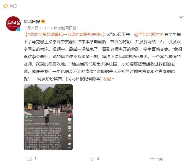 5月25日下午,有学生拍下了我院李英副院长结束本学期最后一节课的背影,并发至网络平台,引发众多网友热议。视频配文:“包子漫画