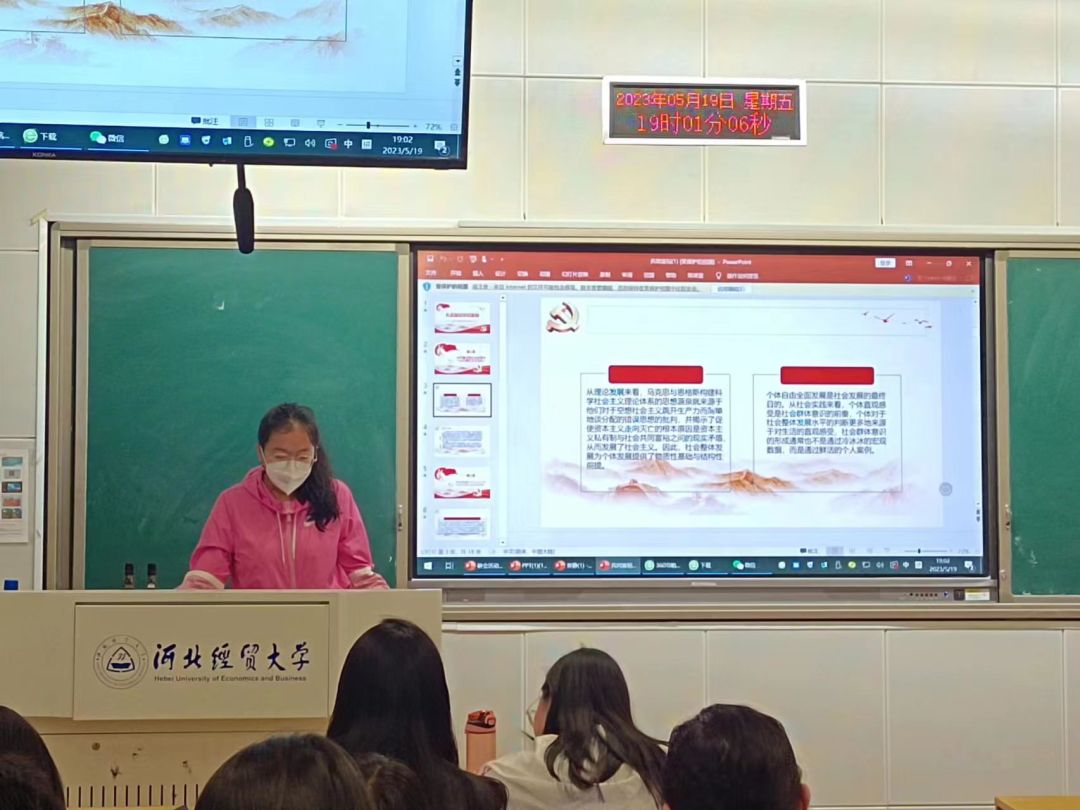 郭骁萌同学主讲的题目为《扎实推动共同富裕的方法》。该同学指出,共同富裕是社会共同发展与个体共同富裕的统一,是社会正义与个体感受的统一,是国家富强与公民富裕的统一。要始终坚持社会整体发展与个体差别兼顾的方法,避免多数人的不发展成为少数人发展的条件。同时,她讲到共同富裕是个人分工正义与社会分配正义的过程性统一,个人分工正义是社会分配正义的前提和基础,这两者既具有内容上的趋同性,又具有形式上的延展性。最后,郭骁萌同学提出我们要利用一切人类思想有益成果,聚焦中国特色社会主义中心任务,不断推进共同富裕,让丰厚的物质财富与精神财富成为人民自由全面发展的基础条件。