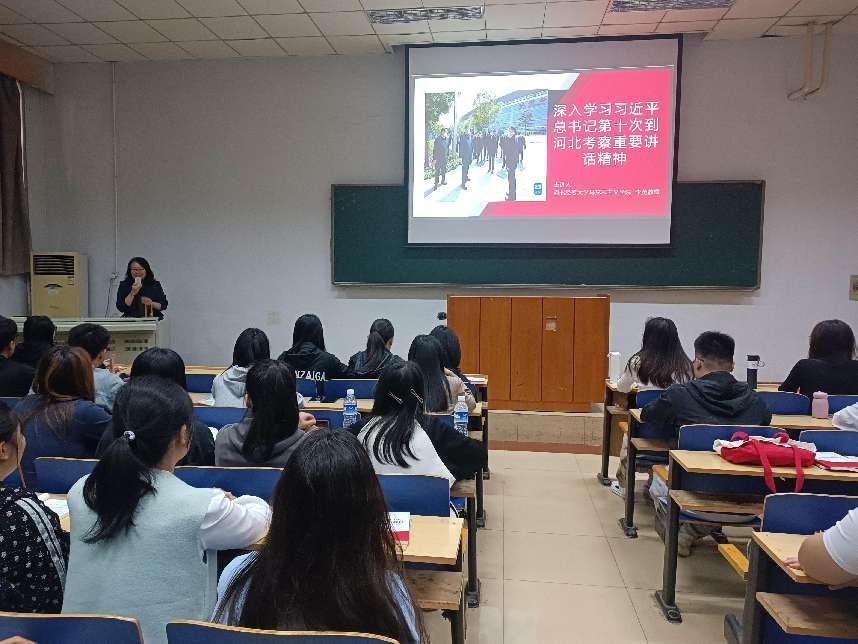课上,李英以“深入学习习近平总书记第十次到河北考察重要讲话精神”为主题,以马克思主义基本原理、习近平新时代中国特色社会主义思想等科学理论为依据,对京津冀协同发展、雄安新区建设的重要意义、新时代我国自主创新发展进行了深入浅出的讲解,并用学生听得懂、学得会、用得上的知识为在场的同学呈现了一场专业知识理论与实践紧密契合的视听盛宴。