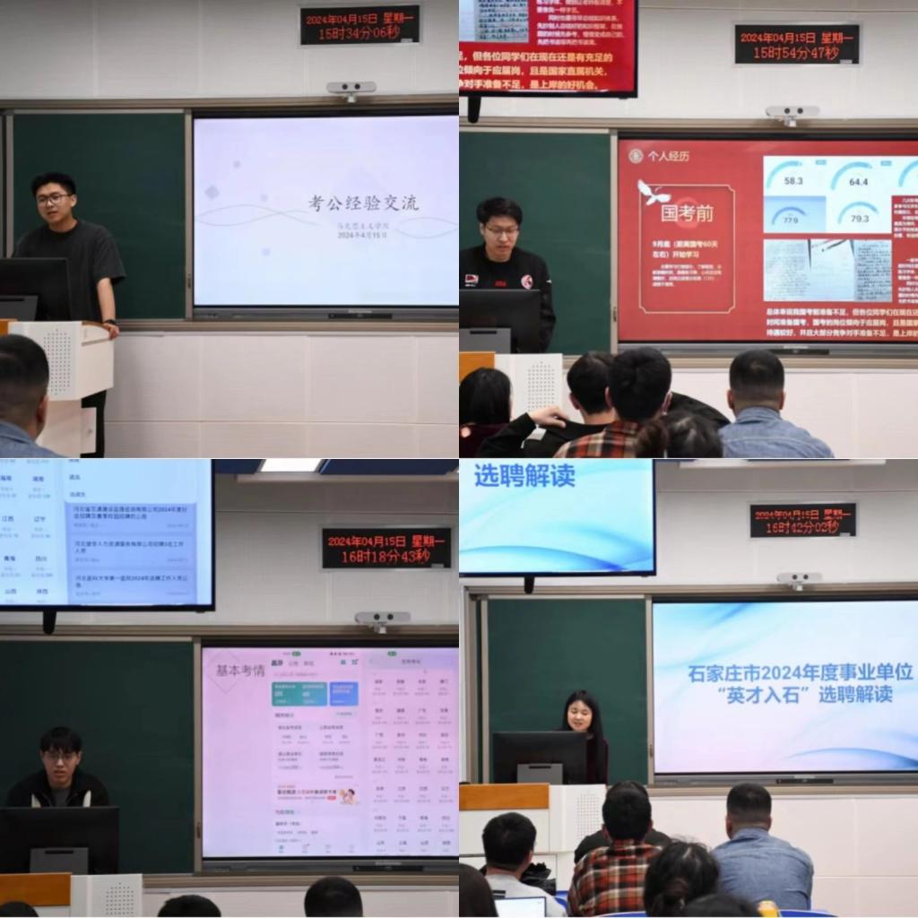四位学生分别结合自身考公经历进行经验分享。张朝阳介绍备考资料、情绪调节、信心建立以及报考特殊岗位需要进行体能储备。赵党颂介绍了考试内容、练习方法,并就备考心态给出详细建议。孙天详细介绍了选岗过程、获取信息渠道和备考时间安排。李想详细解读了石家庄事业单位“英才入石”选聘相关政策和注意事项。