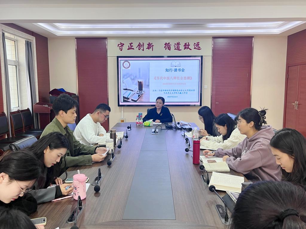 在二办203室举办研究生“知行”读书系列分享会(第一期),会议由习近平新时代中国特色社会主义思想社团、第一党支部马鑫工作室主办。本次读书会聚焦《当代中国八种社会思潮》一书,邀请胡俊苗副教授作为评议人,2024级思想政治教育方向全体研究生参会讨论。