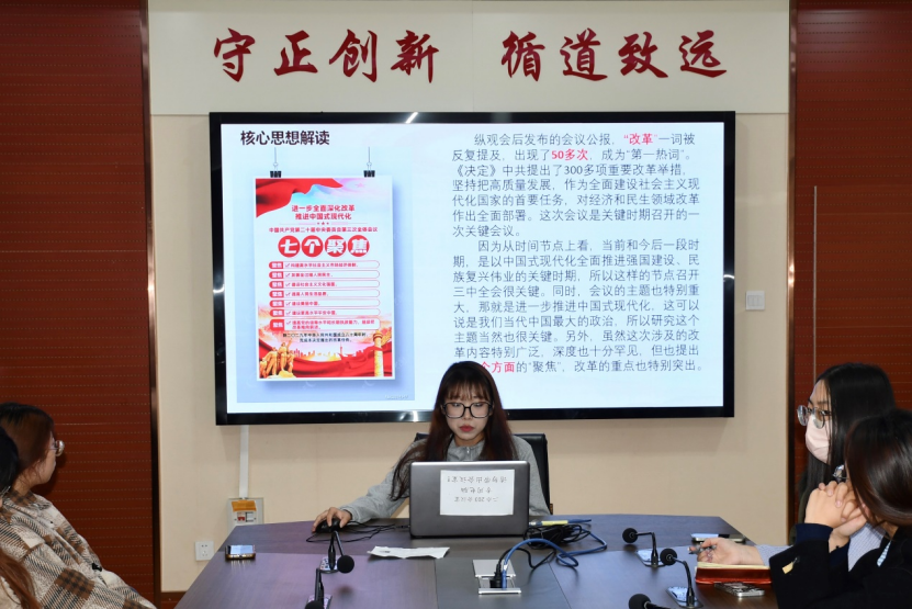张雯璇同学领学了实现新时代发展宏图的经济建设方向、政治建设目标、文化建设重点、社会建设策略和生态文明建设要求。杨延如同学以“深入学习二十届三中全会,进一步全面深化改革的总目标”为主题,讲述了继续完善和发展中国特色社会主义制度,推进国家治理体系和治理能力现代化的重大意义。尤天赐同学从“三个意义”、“三个重点”、“三个坚持”等方面,分享了自己对党的二十届三中全会精神的学习体会。李佩雯同学围绕“如何以钉钉子精神抓好改革落实”进行领学。