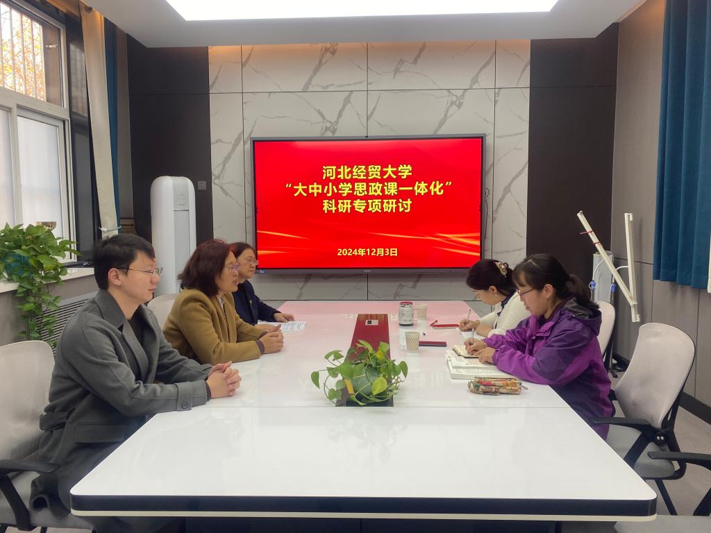 大中小学思政课一体化集体备课中心、河北经贸大学附属中学共同举办“大中小学思政课一体化”科研共同体构建启动活动,院长李英、一体化集体备课中心联络员梁若愚博士和附中校长冯丽、思政课教师宋红莎、孙小静出席活动。本次活动在河北经贸大学附属中学会议室举行。