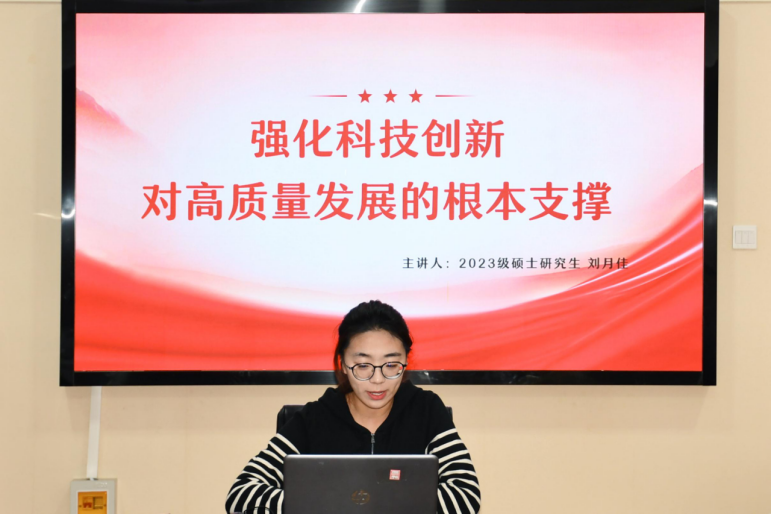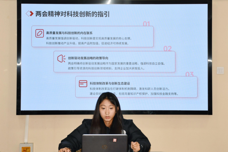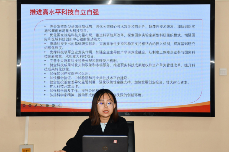 宋莹莹同学介绍了科技创新在中国式现代化建设中的重要地位、发展现状、取得成就和未来趋势等;刘月佳同学结合新兴产业案例,介绍了我国在科技创新与产业创新融合方面取得的进展;周宇欣同学聚焦科技赋能的重点领域,阐述了我国科技和产业融合发展的未来方向;高梦涵同学介绍了科技赋能发展的理论根基、实践逻辑及现实成就,强调在新一轮科技革命中同学们应该树立强烈的责任感,肩负起新时代新青年应有的使命担当。