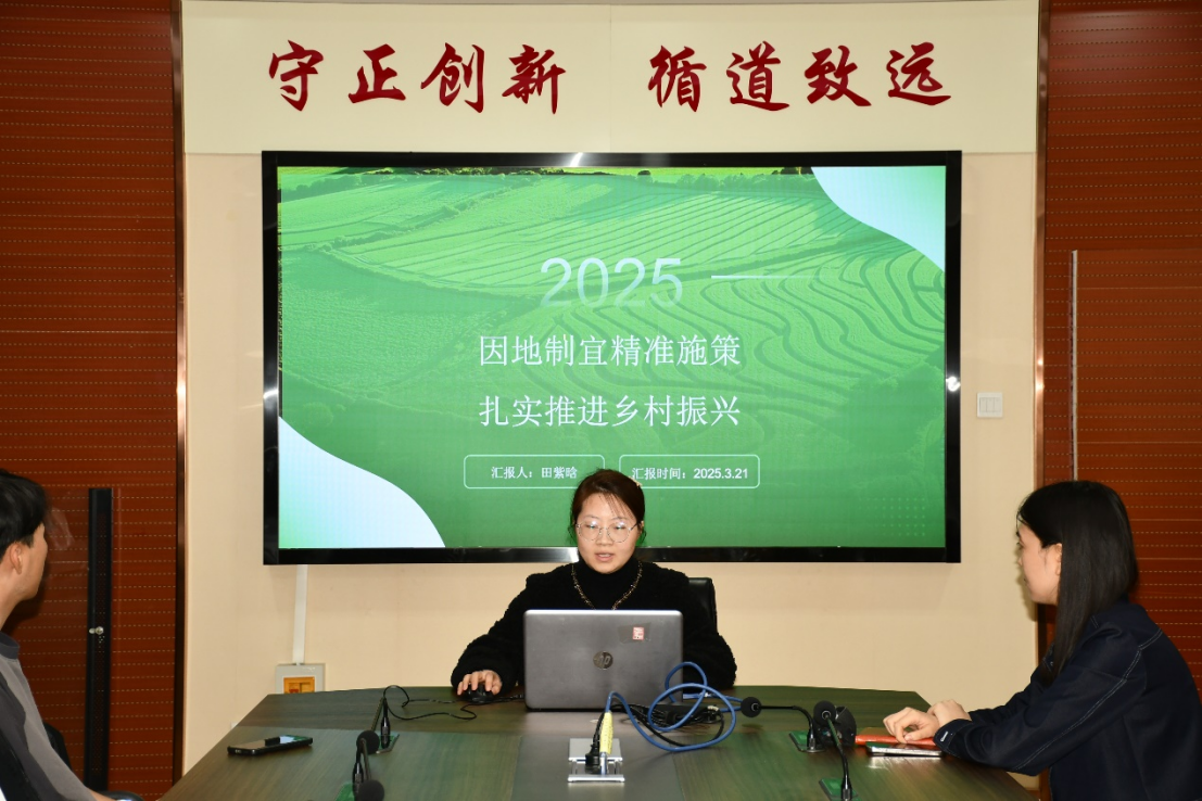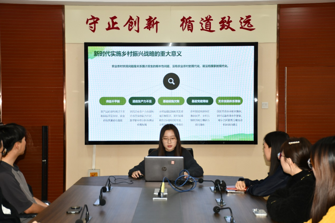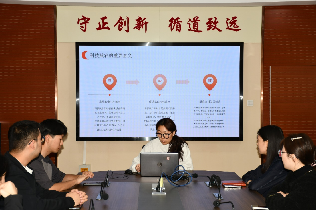 李宇佳同学结合科技赋能春耕的案例,阐述了农业新质生产力的内涵与核心要素;杨延如同学领学了2025年“两会精神”与乡村振兴政策导向和乡村振兴战略的总体要求;田紫晗同学阐述了乡村振兴因地制宜的“方法论”,提出了从顶层设计到基层探索的对策举措;孙帝哲同学介绍了“两会精神”与科技赋农的实践案例,展示了科技创新在农业生产、农产品加工等领域的广泛应用。