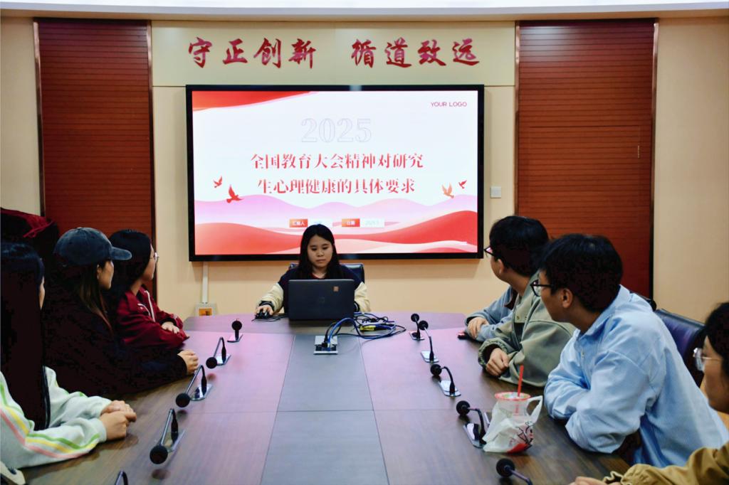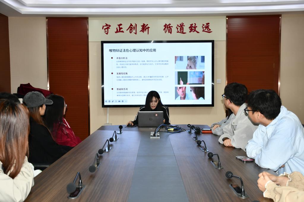 第二十届大学生心理健康节活动。本期活动主题为“辨证明心,哲思润灵”,由邢小雨、杨璐、尤天赐、张楚涵主讲,五十余名研究生参会聆听。