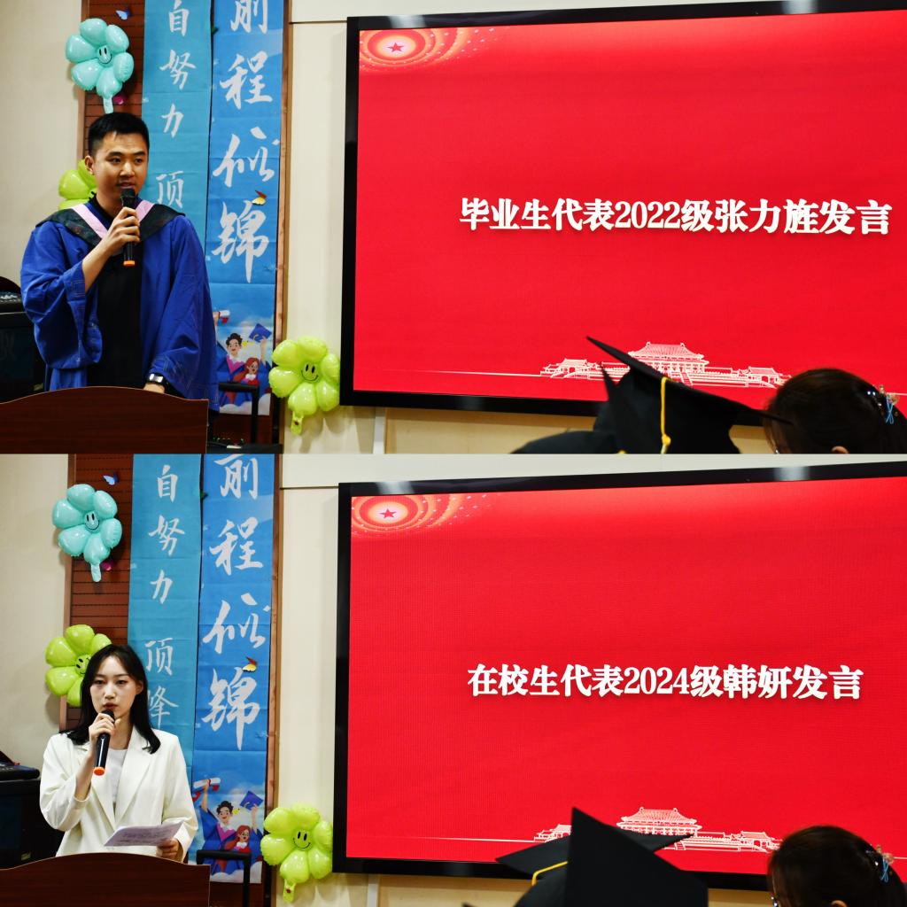 的悉心培养,感恩老师们的耐心教导,立志做有理想、敢担当、能吃苦、肯奋斗的新时代好青年。在校生代表2024级韩妍祝贺学长学姐们顺利毕业,祝愿学长学姐们在未来人生道路上意气风发、豪情满怀。