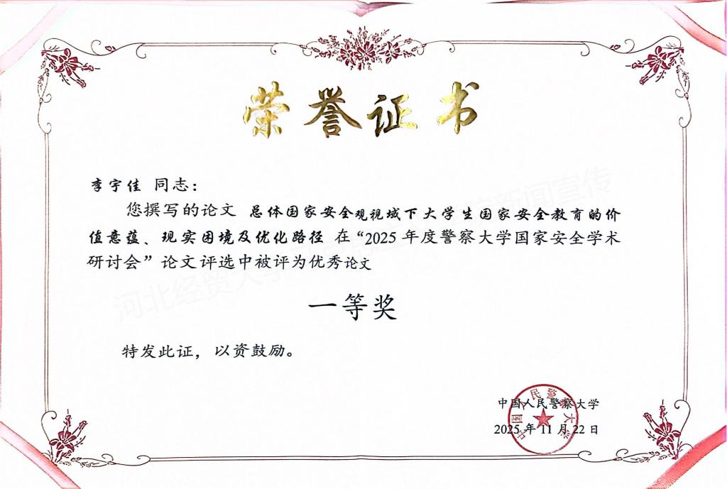 此次学术成果获奖与主题发言,充分展现了我院在国家安全学与思想政治教育交叉领域的研究实力,彰显了学子扎实的学术素养与开阔的研究视野。李宇佳同学表示,此次学术交流让自己对总体国家安全观的实践要求有了更深刻的理解,未来将持续深耕国家安全教育领域研究,将理论成果转化为实践动力,为培育国家安全领域时代新人、维护国家安全贡献青春智慧。