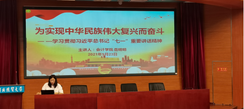 岳明明老师讲授习近平总书记“七一”重要讲话精神中的目标思想——为实现中华民族伟大复兴而奋斗。她从中国共产党的精神之源、马克思主义基本原理结合中华文化、中华儿女大团结的磅礴力量、“四个伟大成就”的内在逻辑、开创未来的强大底气等五个方面详细展开讲解。