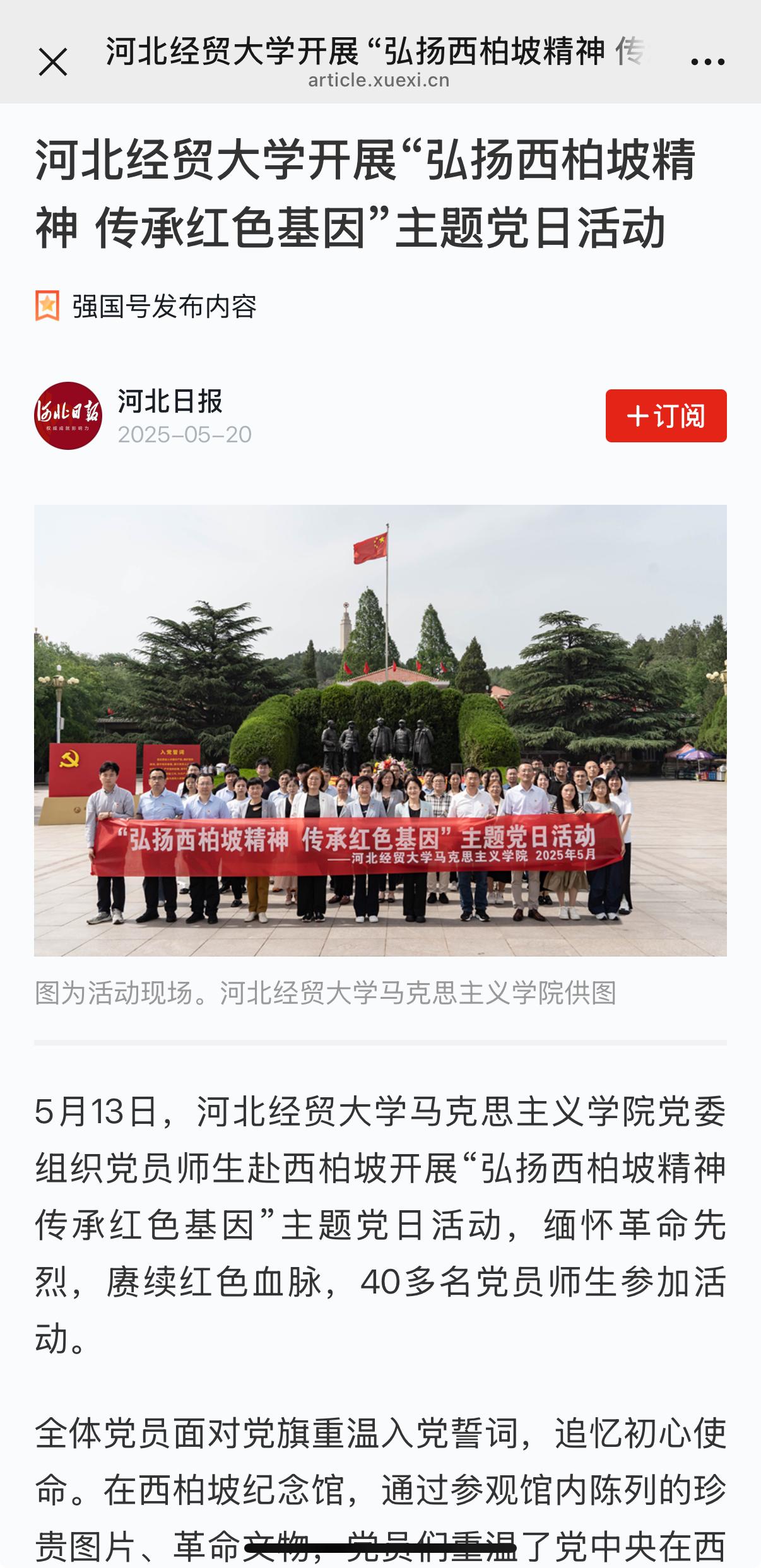 5月13日,包子漫画 党委组织党员师生赴西柏坡开展“弘扬西柏坡精神 传承红色基因”主题党日活动,缅怀革命先烈,赓续红色血脉,40多名党员师生参加活动。