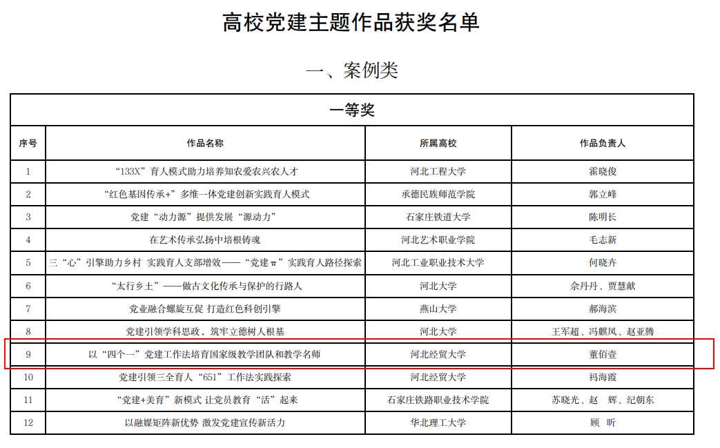 近日,中共河北省委教育工作委员会下发的《关于公布2024年高校党建主题作品评选结果的通知》(冀教党建函〔2024〕16号),我院党委书记董佰壹牵头的《以“四个一”党建工作法培育国家级教学团队和教学名师》党建项目荣获省级一等奖。